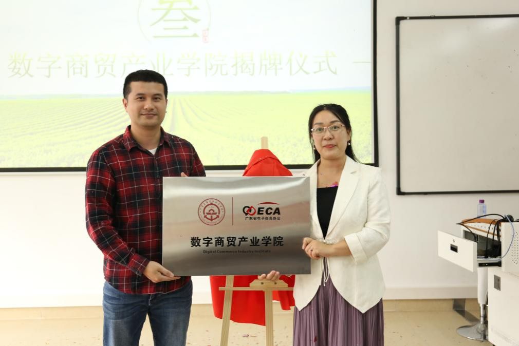活动现场,蔡善文、刘世昌分别代表校企双方共同为“数字商贸产业学院”揭牌。