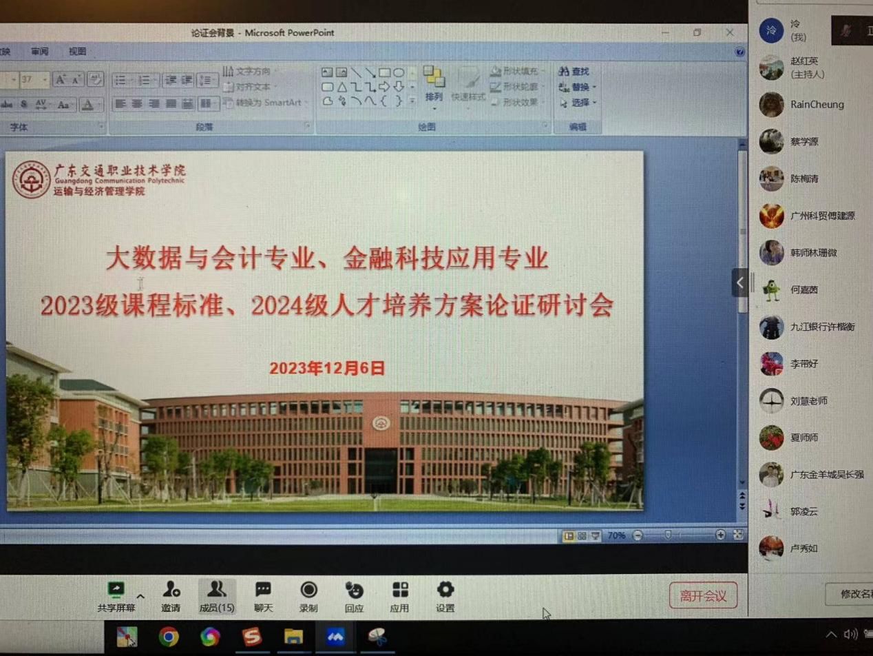 为进一步推动专业群教学改革与课程建设,提高人才培养质量,12月6日,运输与经济管理学院组织召开了大数据与会计专业、金融科技应用专业课程标准论证及人才培养方案修订研讨会,会议采用线上形式,邀请了韩山师范学院经济与管理学院副院长林珊微、广州科技贸易职业学院财经学院金融专业带头人傅建源、九江银行从化支行行长许楷衡、广东金羊城供应链科技股份有限公司财务总监吴长强担任论证专家,大数据与会计、金融科技应用专业全体专任教师参加会议,论证研讨会由运输与经济管理学院副院长赵红英主持。
