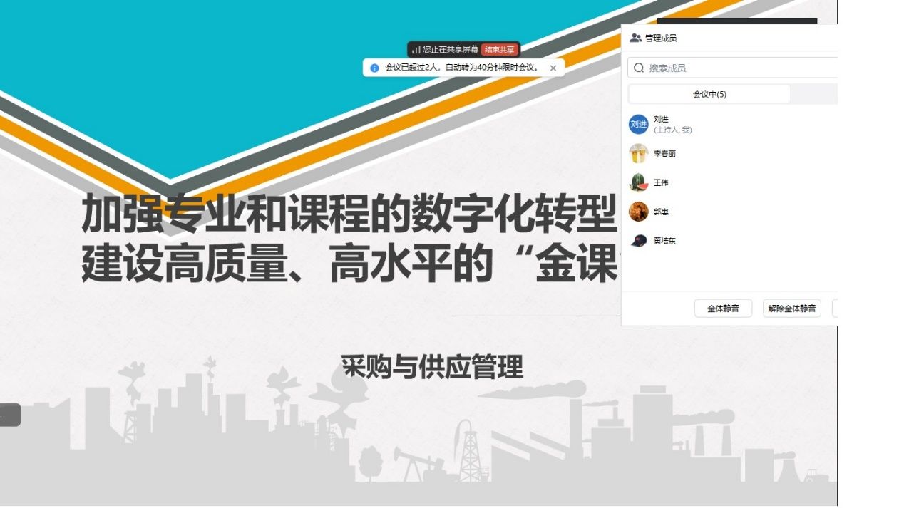 3月27日,采购与供应管理专业成功举办了主题为“加强专业和课程数字化转型,建设高质量、高水平的‘金课’”的研讨交流会。本次活动旨在探讨数字化转型背景下,如何利用现代信息技术手段提升课程教学质量,推动专业课程建设,并推动教育教学模式的创新。本专业的5位教师热情参与了讨论,大家就当前数字化教育发展趋势、教学技术工具的应用以及课程内容的优化升级等话题展开了深入讨论和热烈交流。