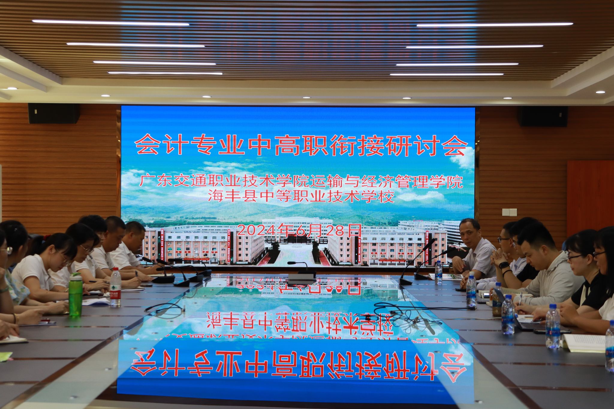 为提高人才培养质量,积极探索与海丰县中等职业技术学校在会计专业三二分段中高职衔接上的深化合作,近日,运输与经济管理学院赴汕尾市海丰县中等职业技术学院,联合举办了“会计专业三二分段中高衔接研讨会”。运输与经济管理学院党委书记伍雄晖、副院长蔡善文、会计专业带头人李伊泠、国贸专业带头人陈伟芝及会计专业的骨干教师,海丰县中等职业技术学校副校长曾向群,海丰县教育局徐传映,驻海丰县服务队副队长聂文锋招生处,招生处、团委、教务部负责人、会计专业负责人和教师代表参加了会议。