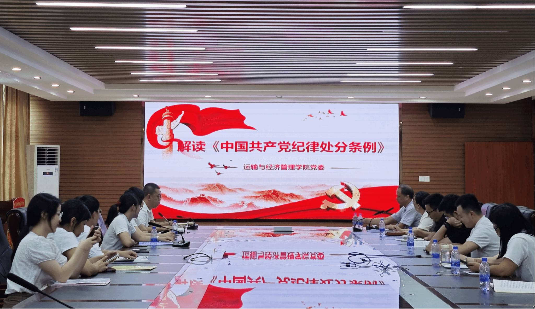 共同学习党纪处分条例。运输与经济管理学院党委书记伍雄晖解读《中国共产党纪律处分条例》专题党课。从《条例》修订的重要意义、突出特点及加强《条例》的学习贯彻等方面展开讲解,结合具体工作实例,讲授了既包含丰富内容又具有明确指导意义的党课。通过学习,党员同志们纷纷表示,开展党纪学习教育不仅要“学”,还要“改”、更要“治”,要通过常态化开展警示教育,提高廉政教育针对性与实效性,做到举一反三、引以为戒。