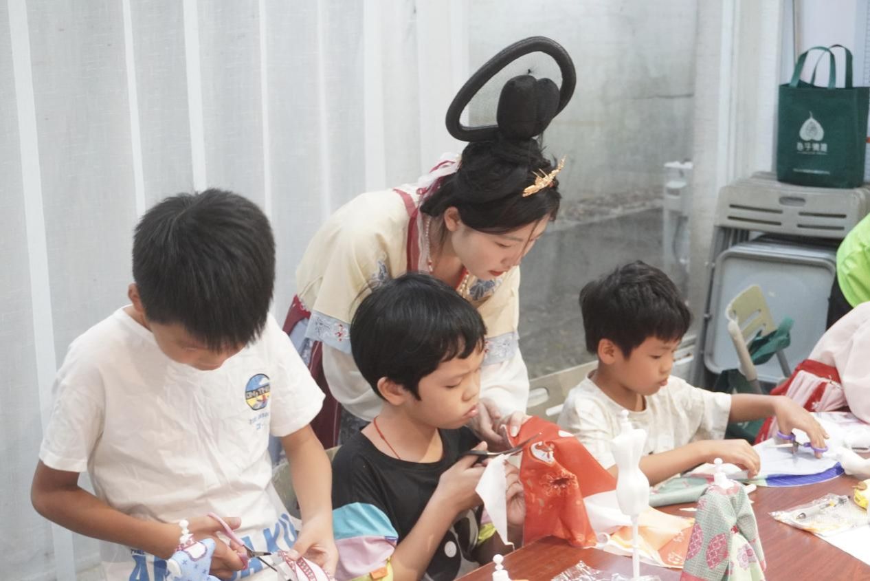 身穿汉服的大学生助教与小学员进行DIY制作