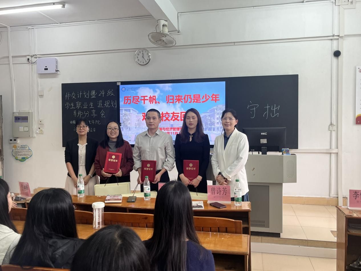 本次活动有利于加强校友与学院之间的合作,实现校友工作的新突破。运输与经济管理学院聘请曾诗芳、古碧成、詹华英、洪燕敏和陈仁俊五位优秀校友为学生的“职业导师”,谢锐琼和赵红英为五位优秀校友颁发了“职业导师”聘书。