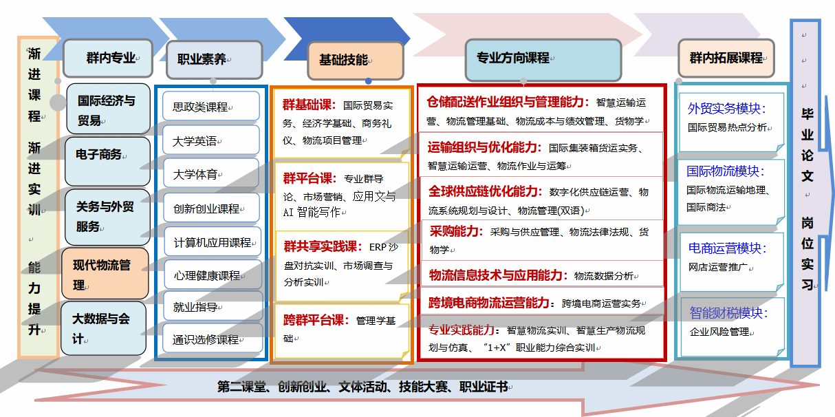 现代物流管理专业: 根据职业岗位分析和人才培养规格,结合专业特点、高职教育教学规律、学生可持续发展需要,构建了融入物流管理职业资格证/1+X职业技能等级证书、现代物流行业专业技术规范,人工智能应用技术规范等,以能力为核心的专业课程体系。