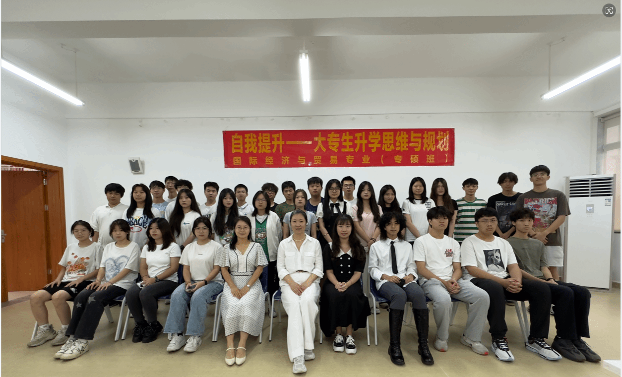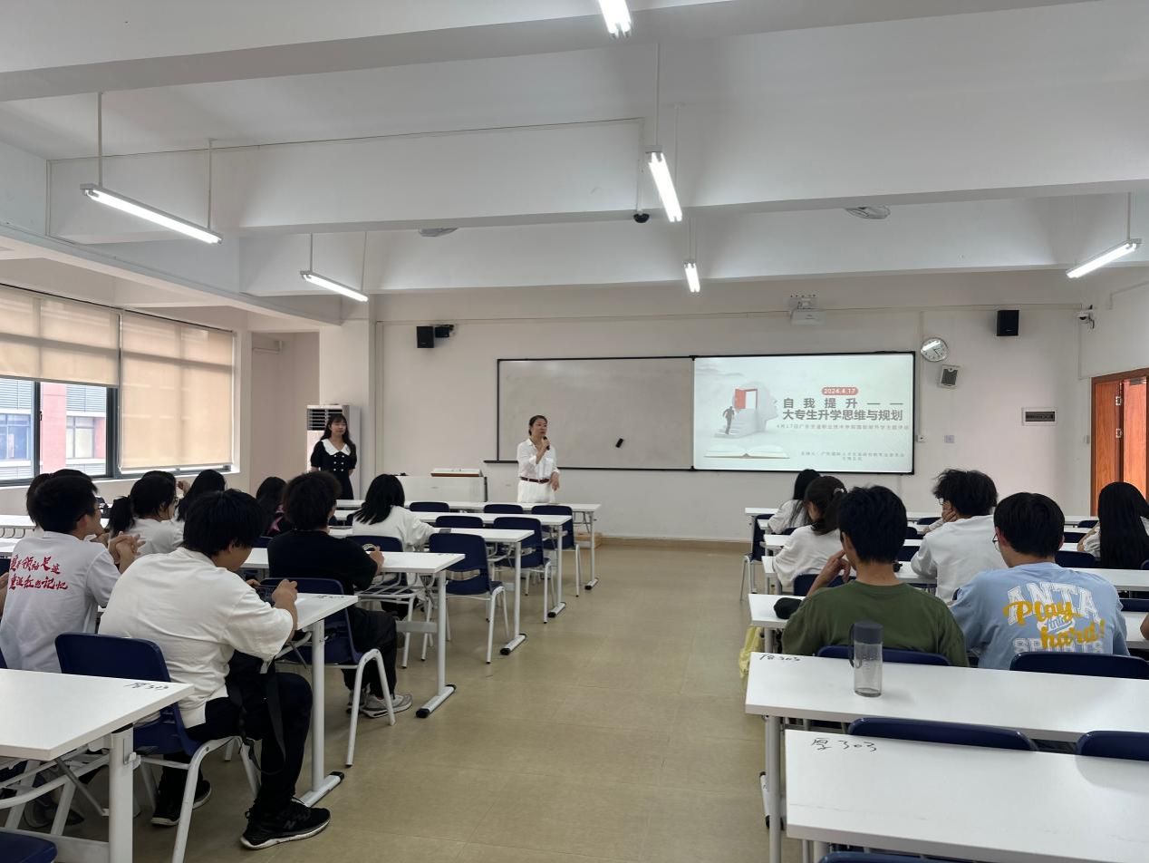 4月17日,2023级国际经济与贸易(2)(专硕连读)班在清远校区厚德楼303开展“自我提升---大专生升学思维与规划”讲座。本次讲座是我校国际班的升学主题讲座。讲座由广东国际人才交流研究院专业委员会王瑛主任主讲。王主任首先从自身的家庭背景、学生生涯、职业经历导入,为同学们讲述了一个生动且富有说服力的励志故事。讲座从为什么要升学、国际班学生升学的道路是什么、如何为升学做准备三个方面展开,为学生指明学习的方向,树立升学思维和升学规划。
