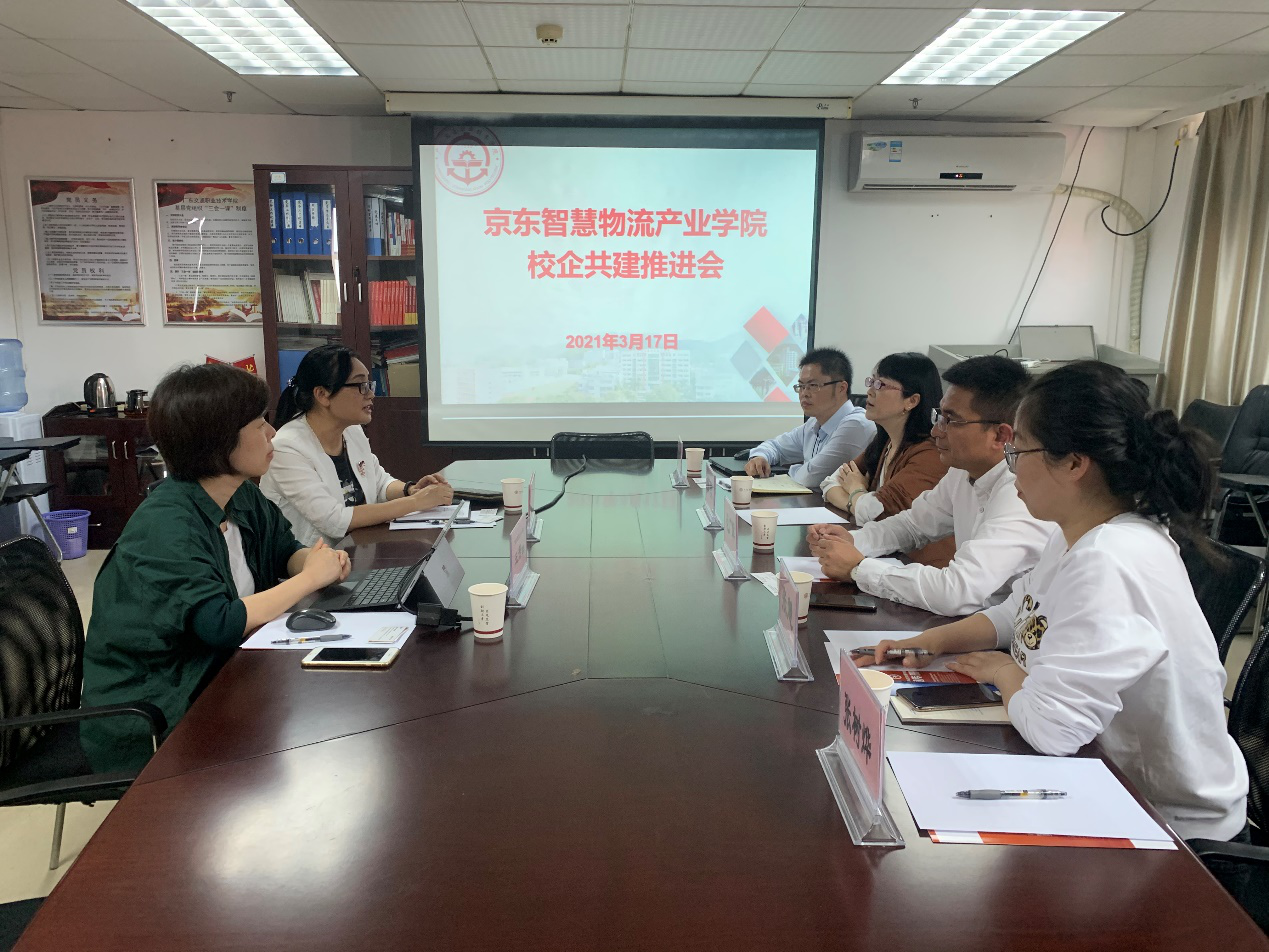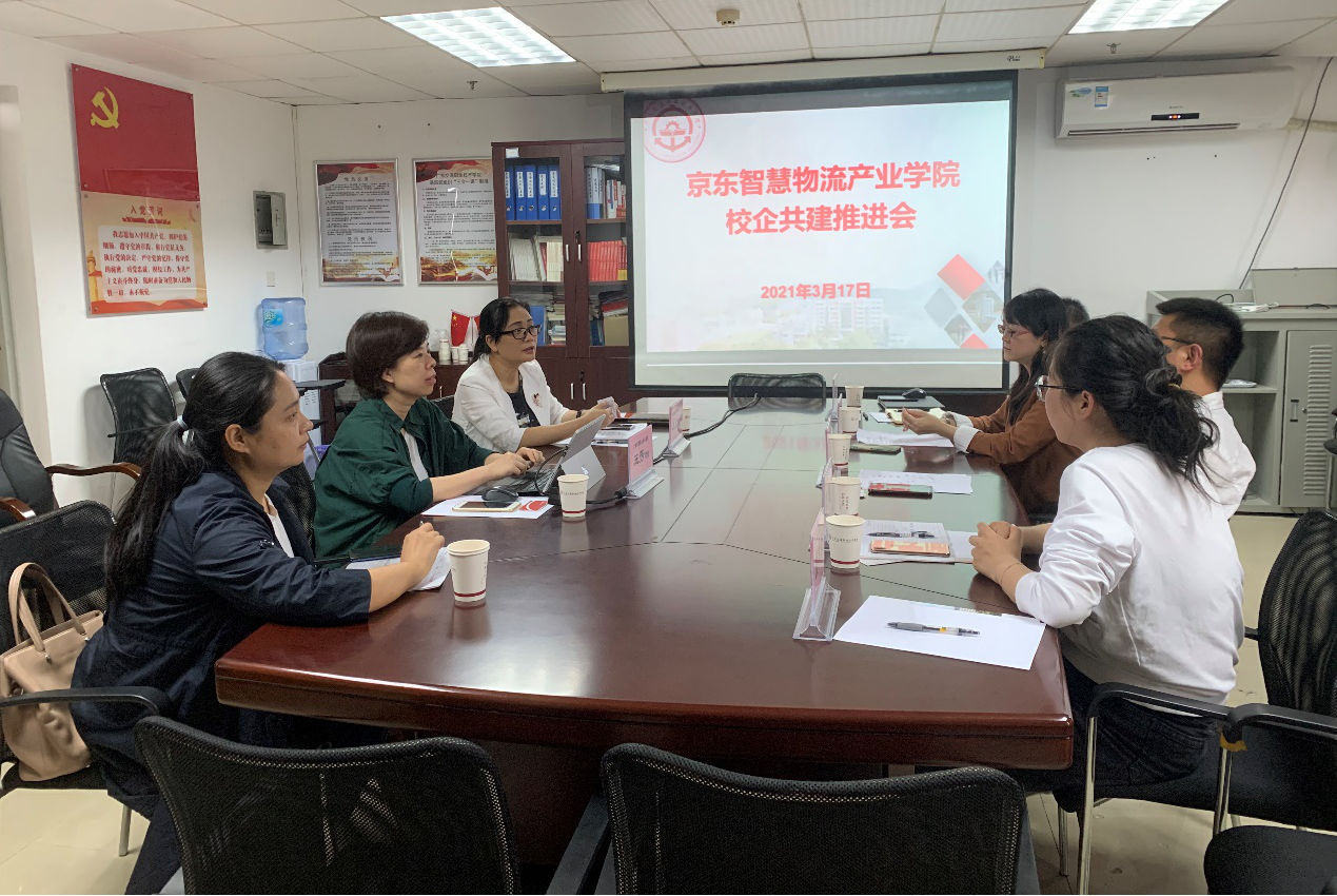 | 2021年3月17日下午,京东智慧物流产业学院校企共建推进会在运输与经济管理学院会议室举行。京东物流集团教育产业负责人范广辉、京东物流集团物流教研总监张慧、京东物流华南教育生态总监张蓉、京东物流华南区智能供应链产业平台规划设计高级经理梁华同运输与经济管理学院院长王龙、副院长王芳及物流管理专业带头人刘如意等出席了会议。