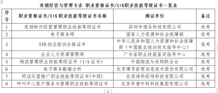 本专业建议学生考取“连锁特许经营管理职业技能等级证书”、“企业人力资源管理师”、“网店运营推广职业技能等级证书(中级)”、等职业资格证书,见下表。