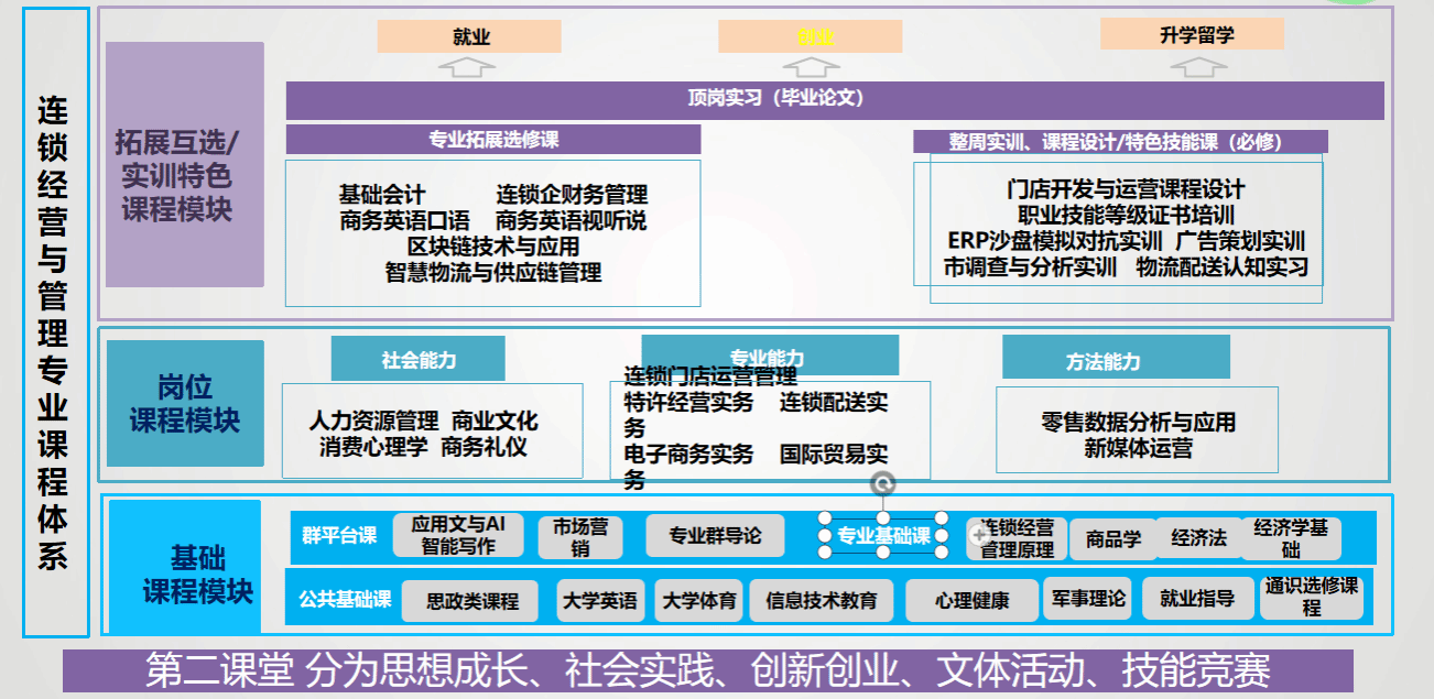 2. 专业能力:掌握连锁门店运营管理、品类管理、采购与供应链管理、特许经营实务等核心技能,能够从事门店管理、商品采购、物流配送等工作。