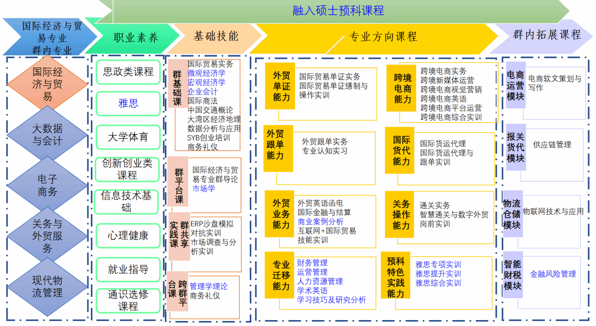 以立德树人为根本任务,全面推进思政课程与课程思政,面向数字商贸产业(链)的粤港澳地区外贸行业企业,培养德、智、体、美、劳全面发展,具有社会主义核心价值观和家国情怀、掌握必要的文化基础知识、国际贸易、外贸英语、跨境电商服务等专业知识和进出口业务开拓、操作与管理职业技能,具备良好的职业素养,能从事外贸业务、外贸跟单、跨境电商、国际货代、报关报检等岗位工作的,具有创新精神的复合型技术技能人才。