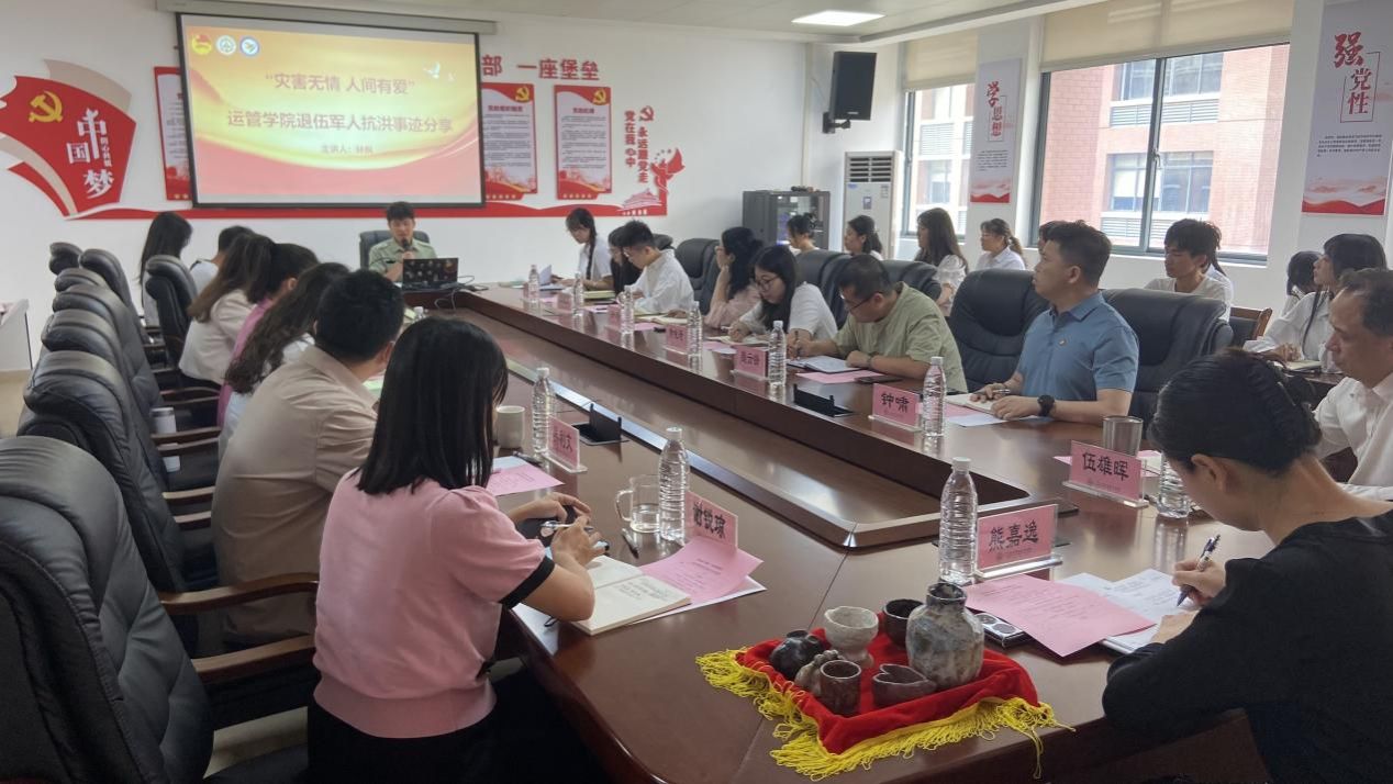 退伍军人林枫同学为大家讲述自己近期在清远英德的抗洪事迹。在战胜自然灾害的艰难时刻,他们用自己的身躯,用党性、忠诚、责任、爱心铸成抵御灾害的铜墙铁壁,用自己的实际行动诠释了什么是青春担当,让在场的成员们深受启发和鼓舞。