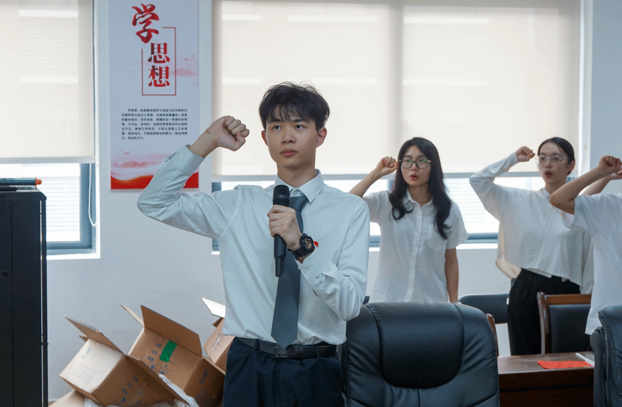 在优秀毕业生缪文杰的领誓下,全体师生党员举起右拳,重温入党誓词。80个字的入党誓词如一面明镜,提醒着每一位党员,时刻保持清醒头脑、明确身份角色,充分认识到作为一名共产党员所肩负的责任和使命。