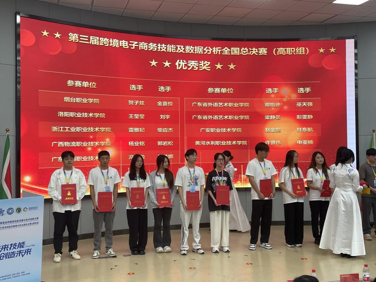 9月20日至23日,由金砖国家工商理事会(BRICS BC)、“一带一路”暨金砖国家技能发展国际联盟(IASDB)、教育部中外人文交流中心等单位联合主办的2024“一带一路”暨金砖国家技能发展与技术创新大赛之第三届跨境电子商务技能及数据分析赛项全国总决赛(高职组)在浙江台州科技职业学院隆重举行。运输与经济管理学院学子斩获全国一等奖的好成绩。