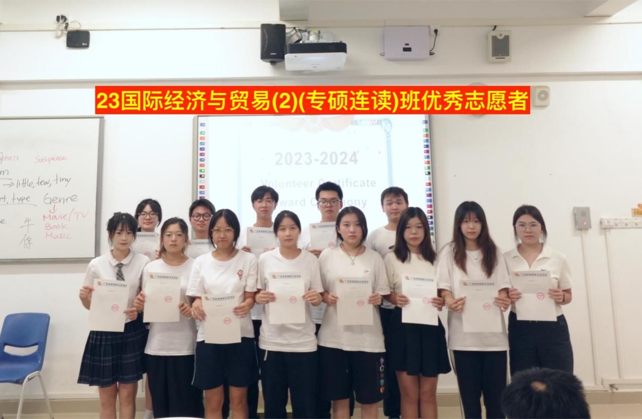 活动的最后,迈克尔•华莱士还为2023级国际经济与贸易(2)(专硕连读)班的13名同学颁发了优秀志愿者证书,该班的志愿者们在2023-2024学年为专硕项目活动的顺利开展,提供了台前幕后的大力支持。未来专硕志愿者项目将持续开展,为外宾接待、筹备专硕活动现场、促进中英专硕项目的宣传等方面继续提供志愿服务。