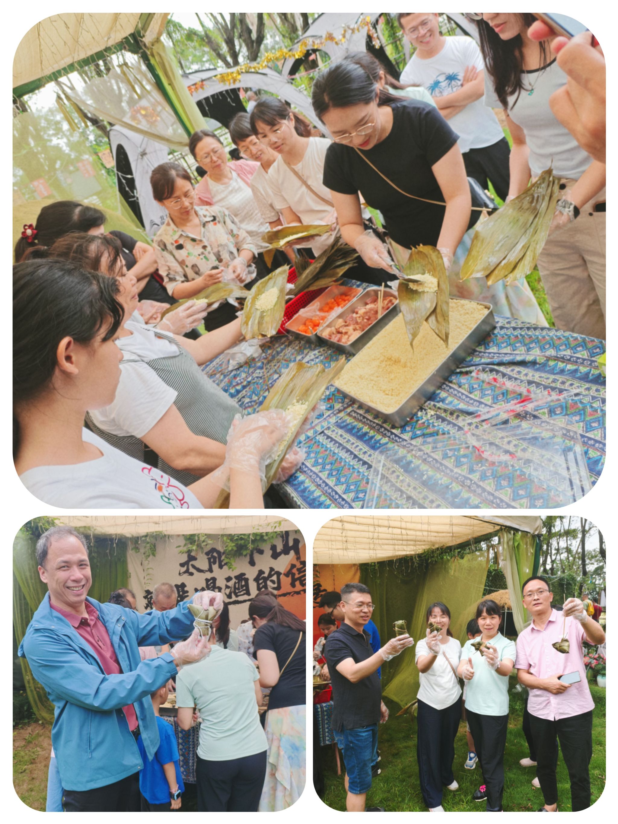 午餐后,进入最具端午特色的环节——包粽子。工会精心准备了糯米、粽叶、五花肉、咸蛋黄等广式粽料,教职工们分组协作,从折粽叶、填馅料,到捆扎成型,一步步体验传统手艺的魅力。现场粽香四溢,欢声笑语不断,大家在动手实践中感受传统文化的深厚底蕴。
