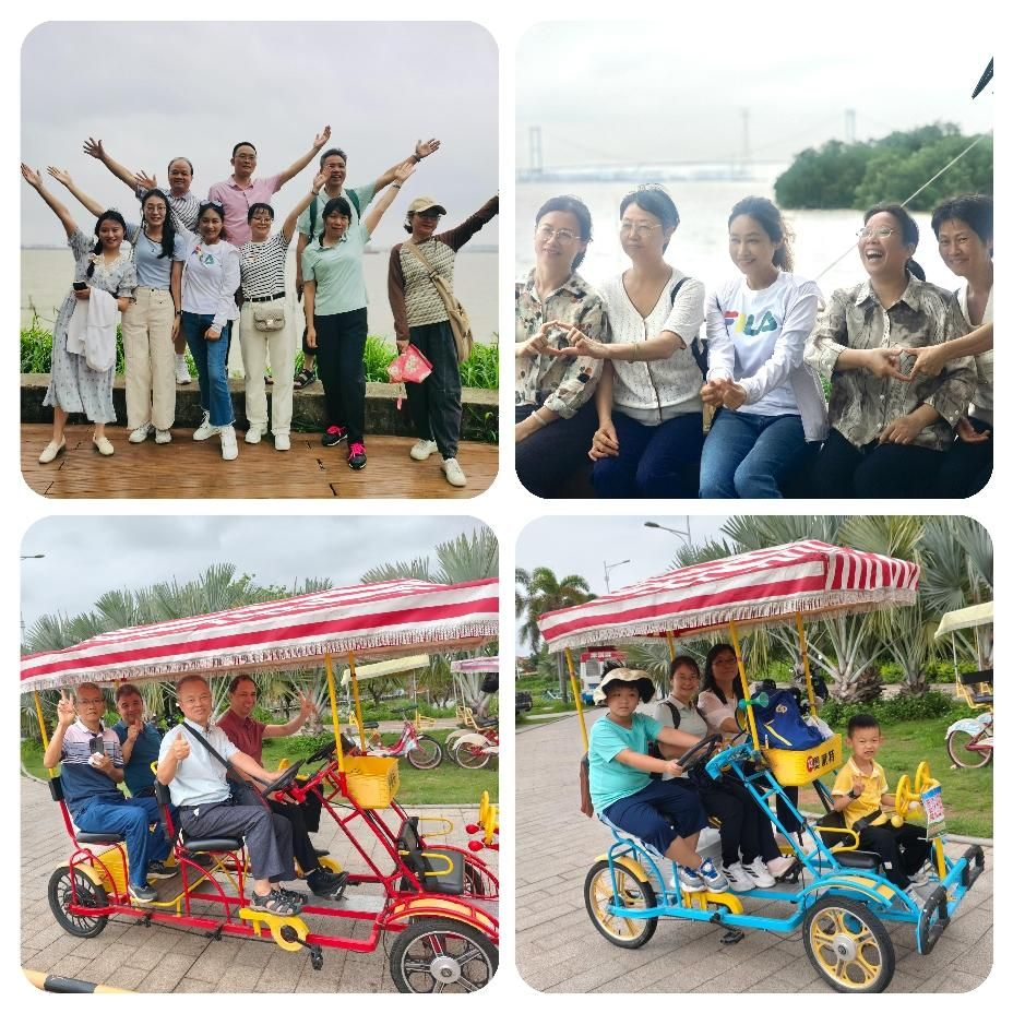 上午10时,教职工们抵达风景秀丽的海鸥岛。作为广州新城的生态明珠,海鸥岛以其13公里的环岛公路和迷人的田园风光成为本次活动的理想场所。教职工们自由组队,选择山地车、双人车或四人车,沿着绿树成荫的环岛公路骑行,感受海风拂面的惬意。沿途的沙滩、农田和渔村风光让大家暂时忘却了工作的繁忙,沉浸在大自然的宁静与美好之中。