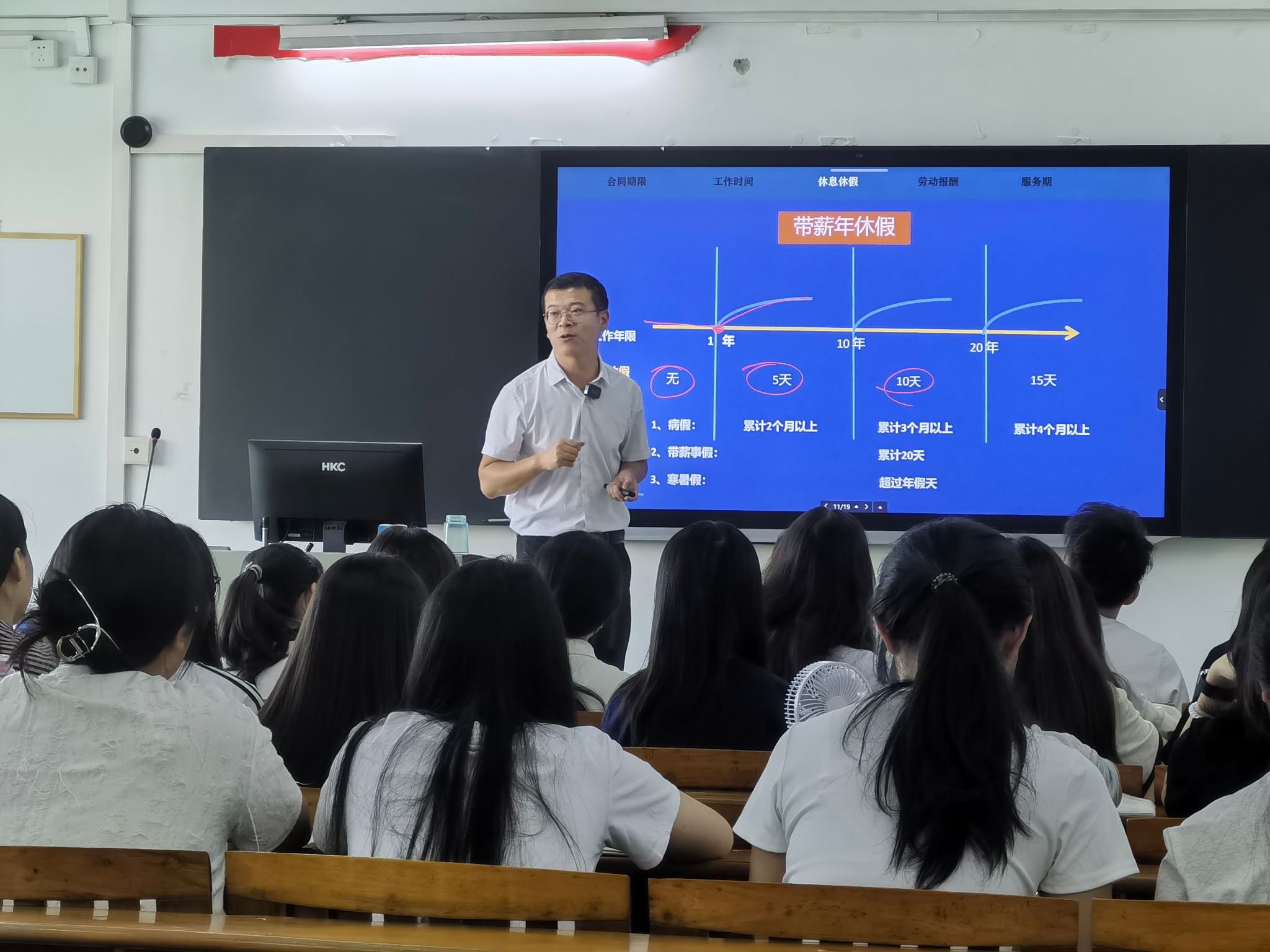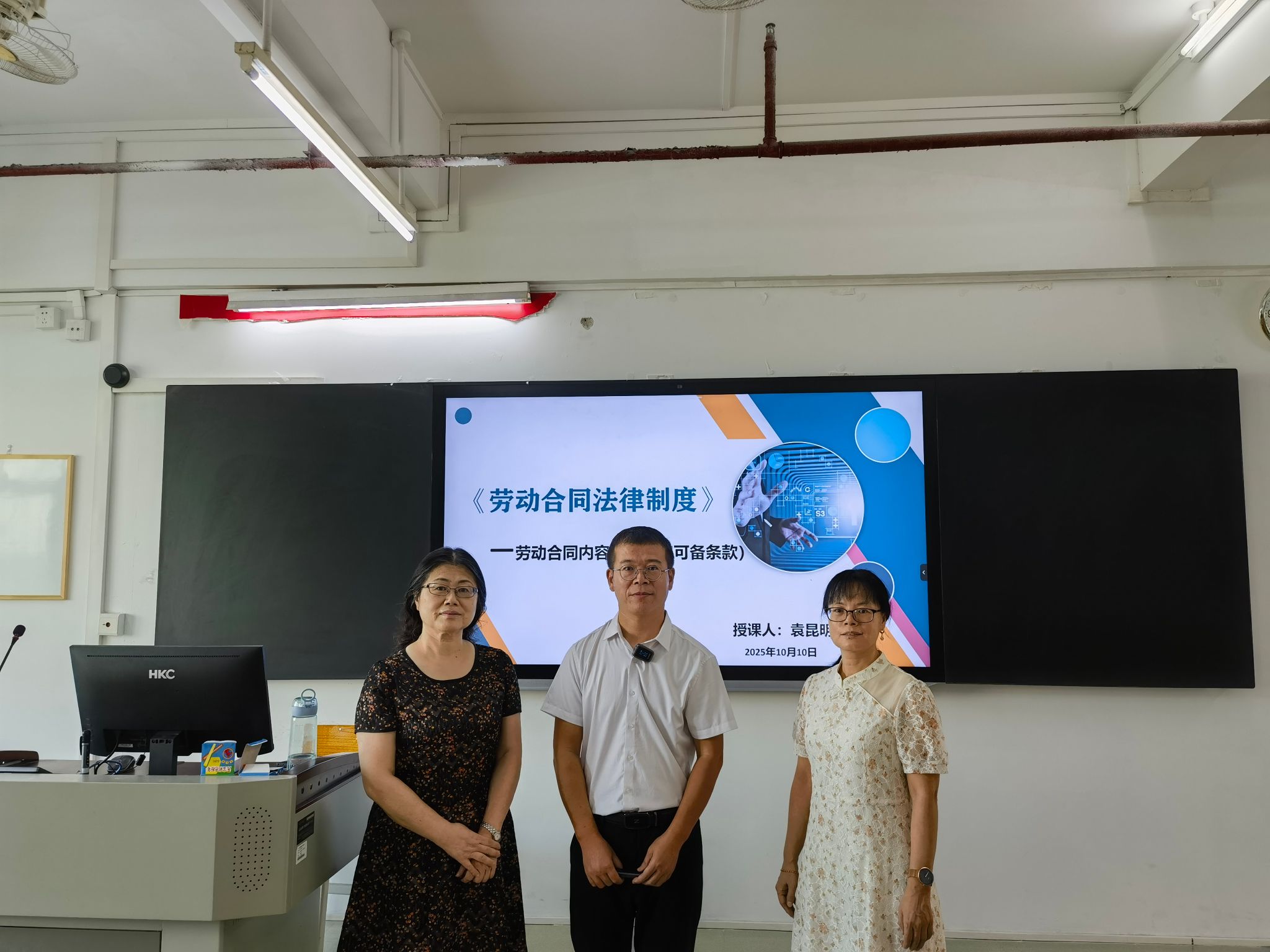 为提高新教师职教能力,帮助新教师尽快适应高职教育教学工作,实现教师队伍整体水平的提升,10月10日,运输与经济管理学院在花都校区1号教学楼605教室举办了一场“线上直播+线下授课”模式的公开课。本次课程由袁昆明老师主讲,内容为《经济法基础》中的“劳动合同法律制度的必备条款与可备条款”章节,面向2025级金融科技应用2班全体学生。运输与经济管理学院副院长赵红英、学院督导曾艳英现场听课指导。