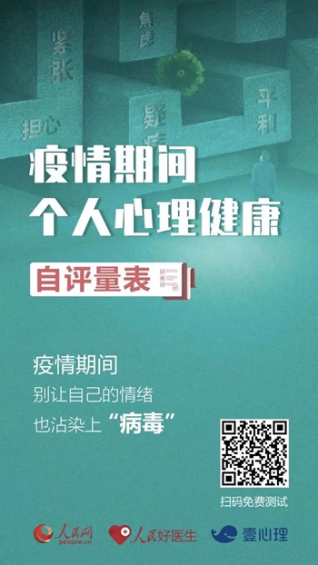 新冠肺炎时刻牵动着全国人民的心。由于疫情,大家的正常生活和工作受到一定的影响,可能会出现焦虑、害怕以及恐慌等情绪。连日来,你是否无法辨别各种各样的疫情信息?是否感到心理状态和生活节奏被完全打乱?长时间“宅”在家里是否感到无措?……人民网“人民好医生”客户端联合壹心理推出《疫情期间心理健康自评量表》,带给你温暖而专业的解答。
