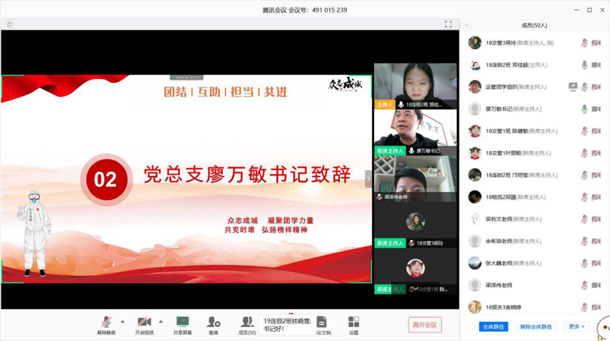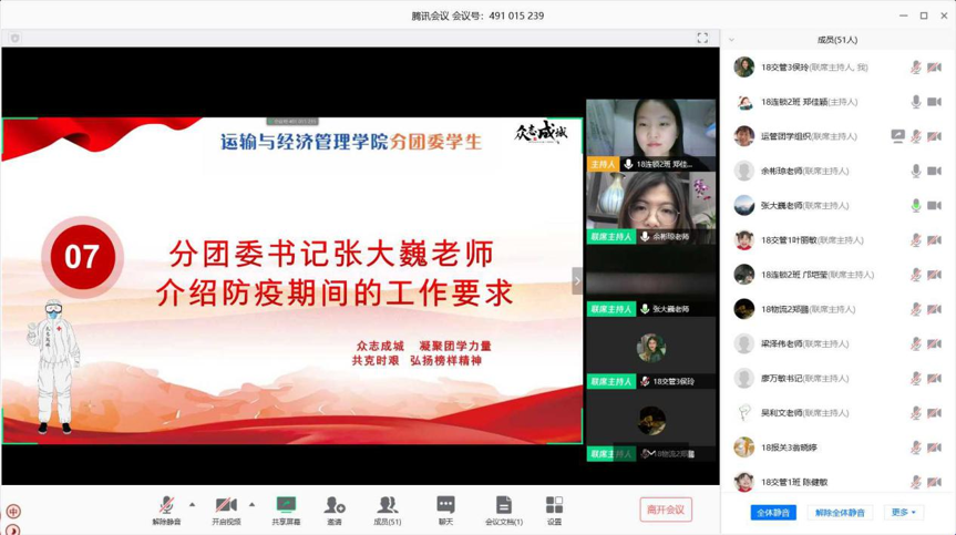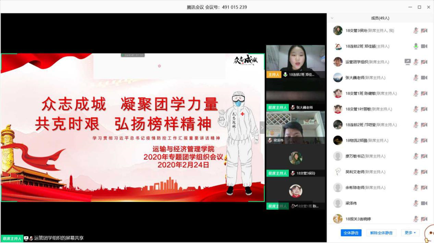 为全面贯彻习近平总书记关于坚决打赢新型冠状病毒感染的肺炎疫情防控阻击战的重要指示精神,认真落实党中央、国务院决策部署和省委、省政府工作要求。加强学生在疫情期间的防控能力和提高防控知识。根据学校团委《关于通过网络视频开展各级团学组织会议的通知》,我院于2020年2月24日上午通过网络视频的方式顺利开展团学组织会议。参加本次会议的有:运输与经济管理学院党总支廖万敏书记、分团委书记张大巍、学生会指导老师余彬琼、梁泽伟、吴利文及团学组织18、19级学生干部。