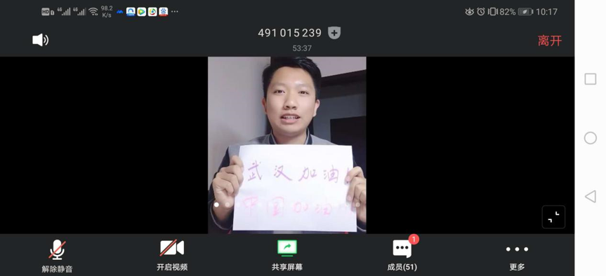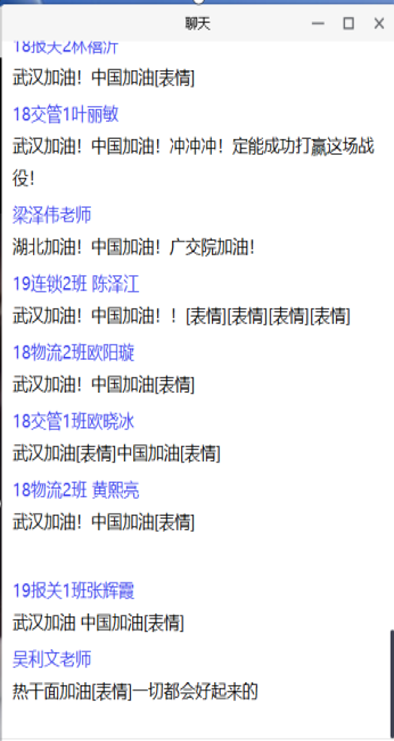 在观看抗疫视频的同时,聊天窗口汇集了老师和同学们的一声声“武汉加油”,一句句“中国加油”,他们展现了广交学子应有的名族情怀和历史使命感,为武汉及奋斗在一线人员加油。