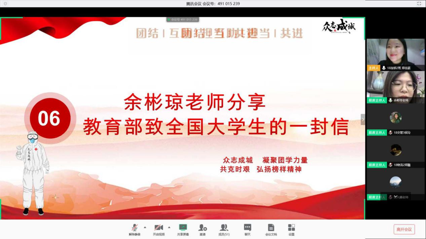 余老师结合例子来解读这封信,让我们对“教育部致全国大学生的一封信”有了更深层次的理解,懂得了万众一心迎挑战,众志成城战疫情。同时,强调学习不再乎形式,要通过多途径去更好的学习。让我们更加坚信,乌云遮不住太阳,疫情挡不住春天的来临。
