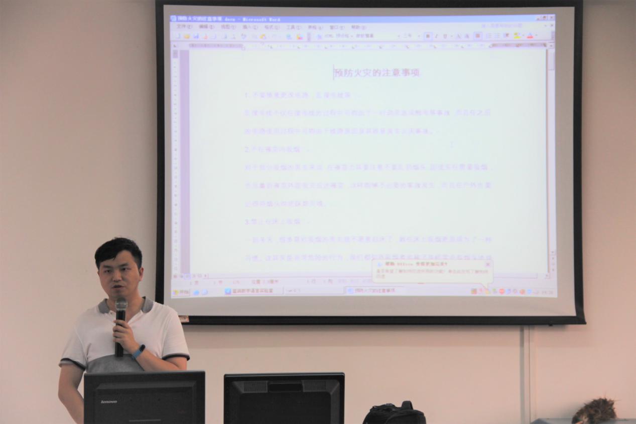 辅导员钟啸老师从宿舍楼安全、教学楼安全及实训室安全三个方面,分析了可能发生的消防事件,并提醒师生,对待突发消防事件,要牢记三点:稳定情绪,撤离有序、安全逃生。
