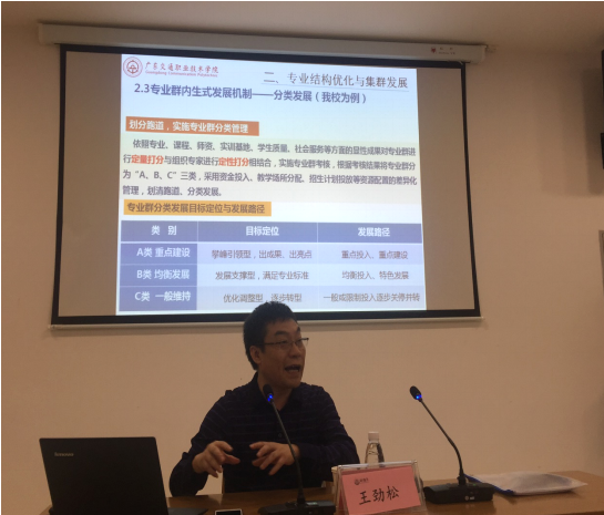 广东省高职教育教学管理委员会秘书长、高职教务处处长联盟主席,我校教务处处长王劲松教授从广东省专业设置现状与问题分析、专业结构优化与集群发展和专业群人才培养方案的制定与落实等方面作了题为《产教融合,对接产业开展专业结构优化和培养方案设计的实践》的精彩报告,现场掌声不断。