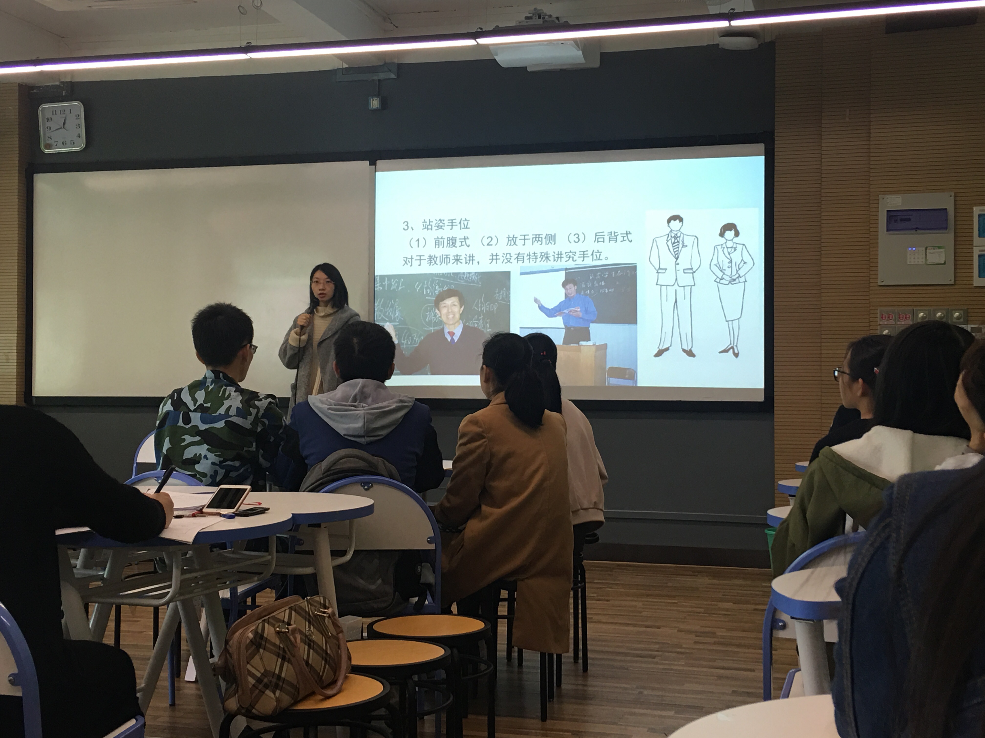 林媛媛老师围绕教师的站姿、走姿、坐姿、表情、手势等五大部分内容进行了详细讲解。在讲解的过程中,林老师善于调动学生的积极性,在亲自示范正确的仪容仪表姿态后,让学生又进行各种模拟示范,教学效果非常流畅,教学内容结构清晰、层次分明,重难点突出,总体效果非常不错。