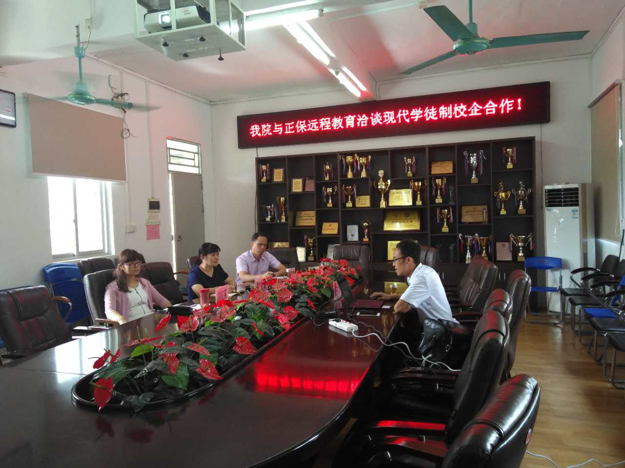 为了加强品牌专业建设,开展校企深入合作,2017年9月25日,运输与经济学院副院长贺胜军、党总支副书记伍雄晖、会计专业负责人赵红英与正保远程教育市场部总经理田久学就会计专业现代学徙制校企合作办学进行洽谈。