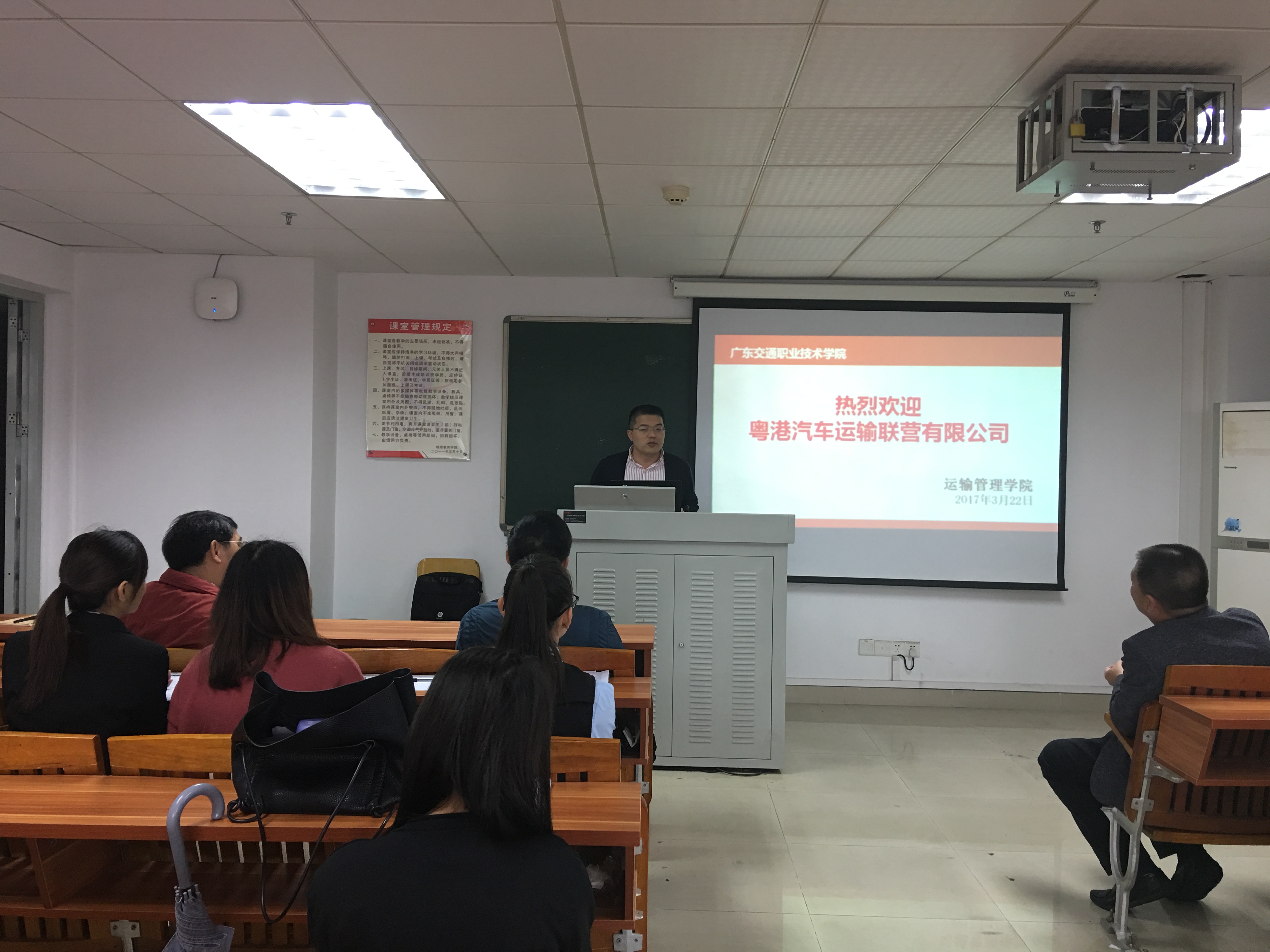 为做好2017届毕业生专项就业指导,打造就业服务特色,2017年3月22日,粤港汽车运输联营有限公司客运分公司总经理罗成镇等一行三人应邀到运输管理学院开展了交通管理类专业专场招聘暨交通特色校企合作洽谈。学院党总支书记廖万敏、院长吴毅洲及相关辅导员出席了会议。此次活动主要面向运输管理学院公路运输与管理和城市交通运输两大专业。