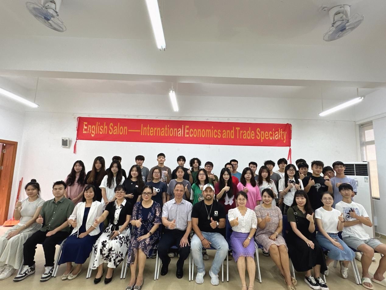 6月11日下午,运输与经济管理学院2023级国际经济与贸易(专硕连读)班在清远校区厚德楼303举行了本学期最后一次英语沙龙活动。沙龙为同学们提供了一次精彩的文化交流盛宴。本次活动由外教Dairo主讲,主题为“Personal Interests and Hobbies”(个人兴趣和爱好)。活动现场气氛热烈,外教与学生们互动积极。运管学院党委书记伍雄晖、院长王龙、副院长赵红英和刘如意、副书记谢锐琼、辅导员许燕君、班主任熊祖娟等参加了活动。